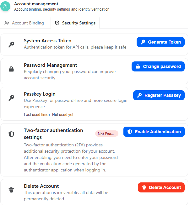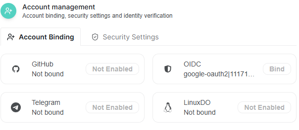 Currently, account bindings can be disabled by the administrator. When enabled, this section allows you to bind supported providers to simplify login and identity verification workflows.