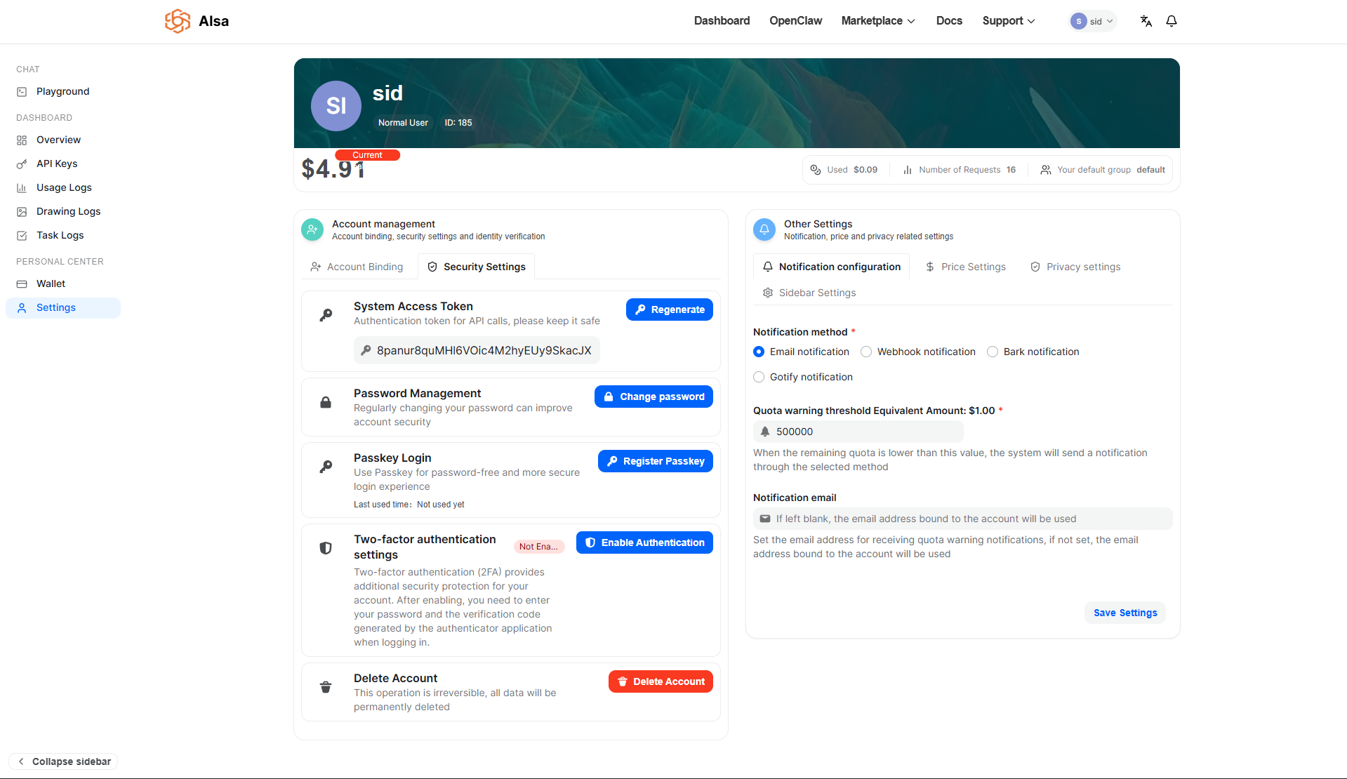 The Settings page consolidates all account-level operational controls, ensuring security, cost awareness, and interface flexibility are managed in one location.
