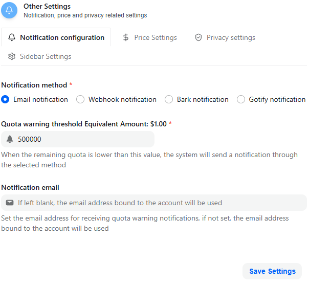 Notification settings allow you to define how the system alerts you when your remaining quota reaches a specified threshold.