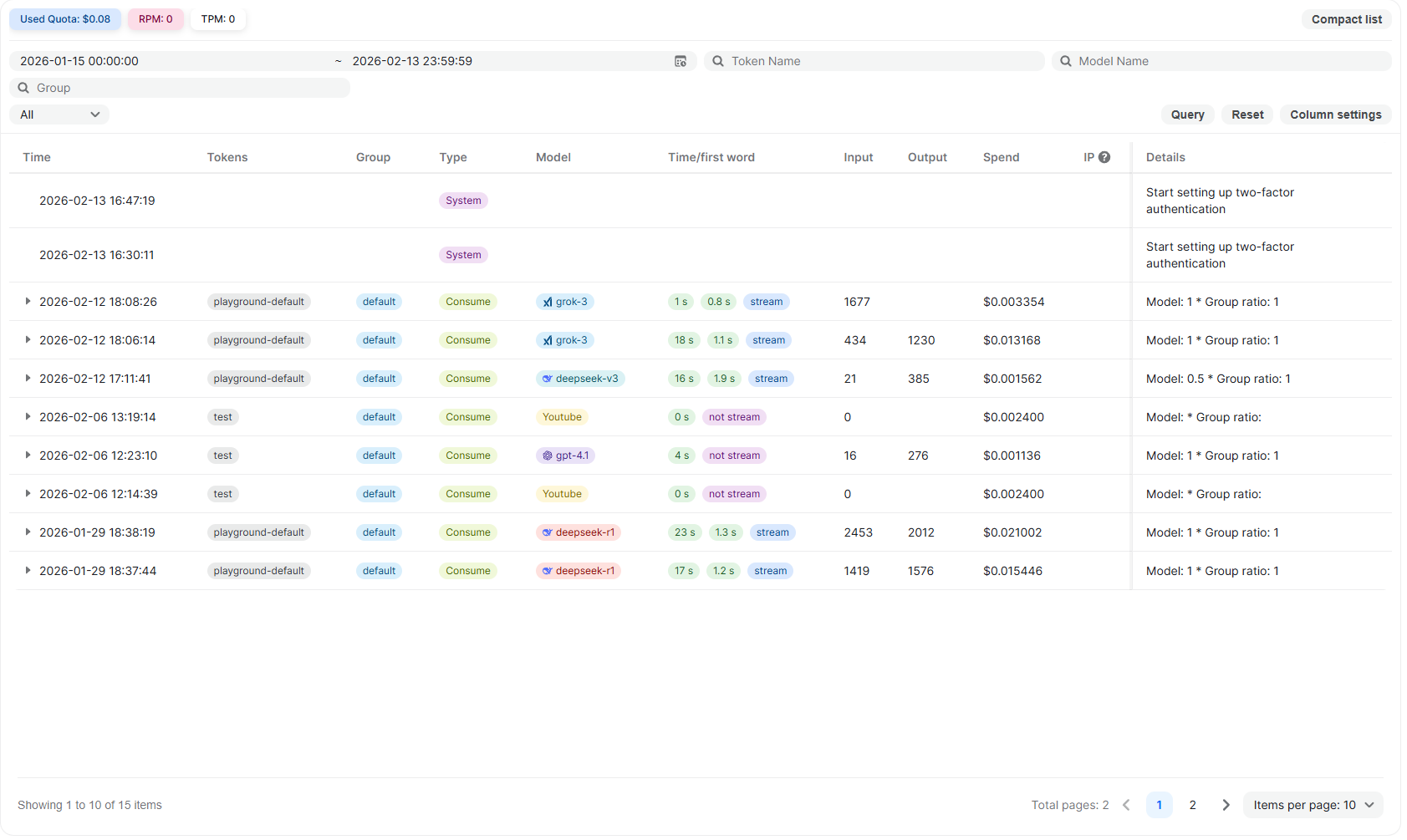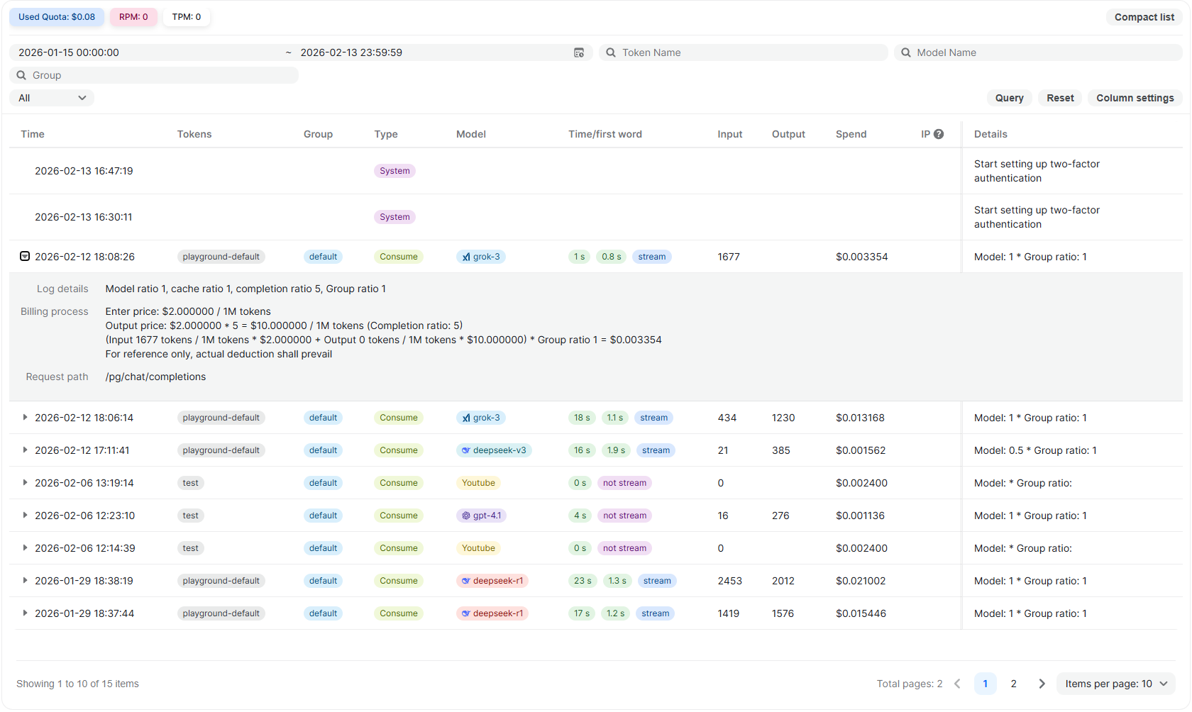 The Usage Logs page provides a complete history of activity associated with your account. It records API requests, token consumption, billing details, and important system-level actions, allowing you to monitor usage, verify costs, and audit account events in one place.